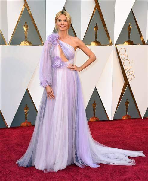 Heidi Klum * Vestido Marchesa --> O que é isto? Eu nem sei o que dizer deste vestido, não gosto do tecido, da cor, tem demasiada informação com flores, decote, o facto de ter só uma manga.